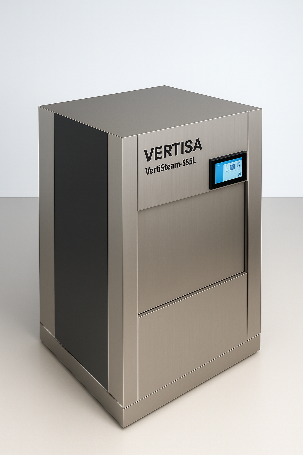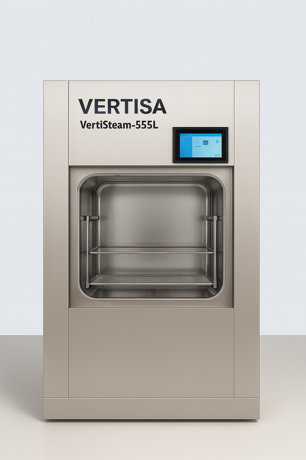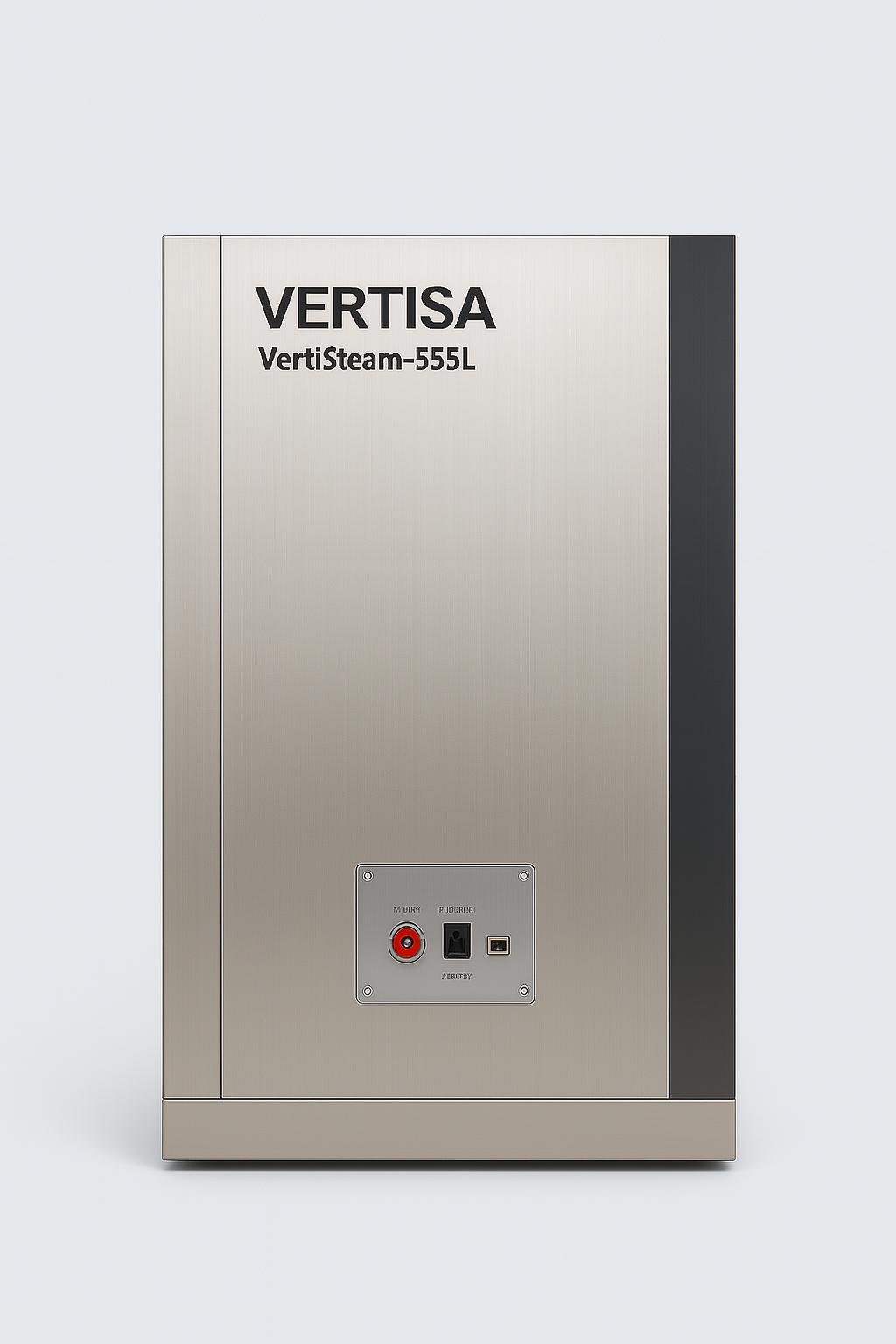 The Vertisa VertiSteam 555L Steam Sterilizer is designed to the highest standards for the sterilization of surgical instruments, textile products, rubber, and heat-resistant plastic materials. Combining reliability, ease of use, and efficiency, this model features a chamber made of AISI 316L grade stainless steel, ensuring long service life and excellent corrosion resistance. Its advanced PLC control system and 7-inch color touchscreen provide precise management and monitoring of all sterilization cycles. The device is fully compliant with key European regulations, including the Medical Device Directive (93/42/EEC), the Pressure Equipment Directive (2014/68/EU), and the EN285 standard.