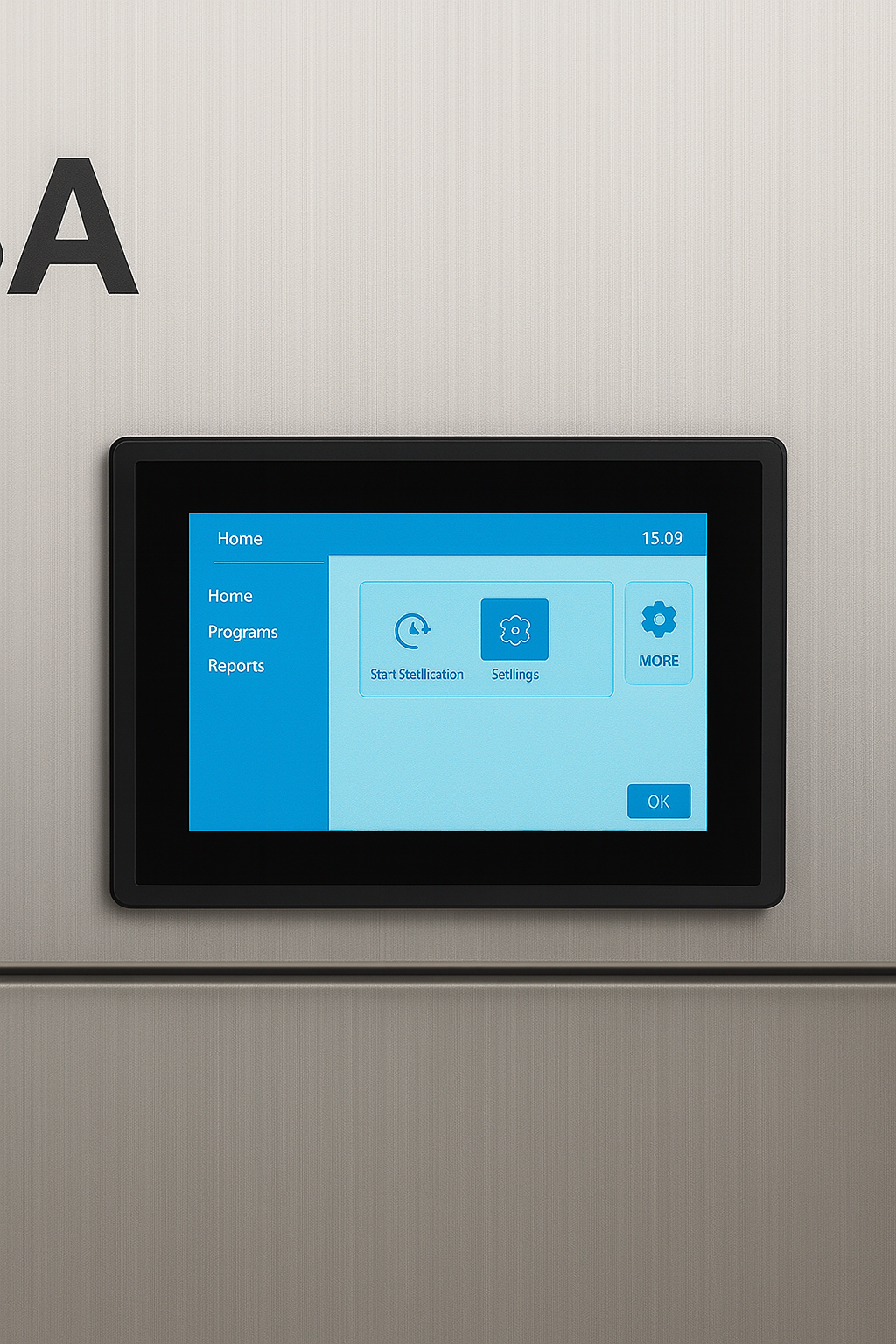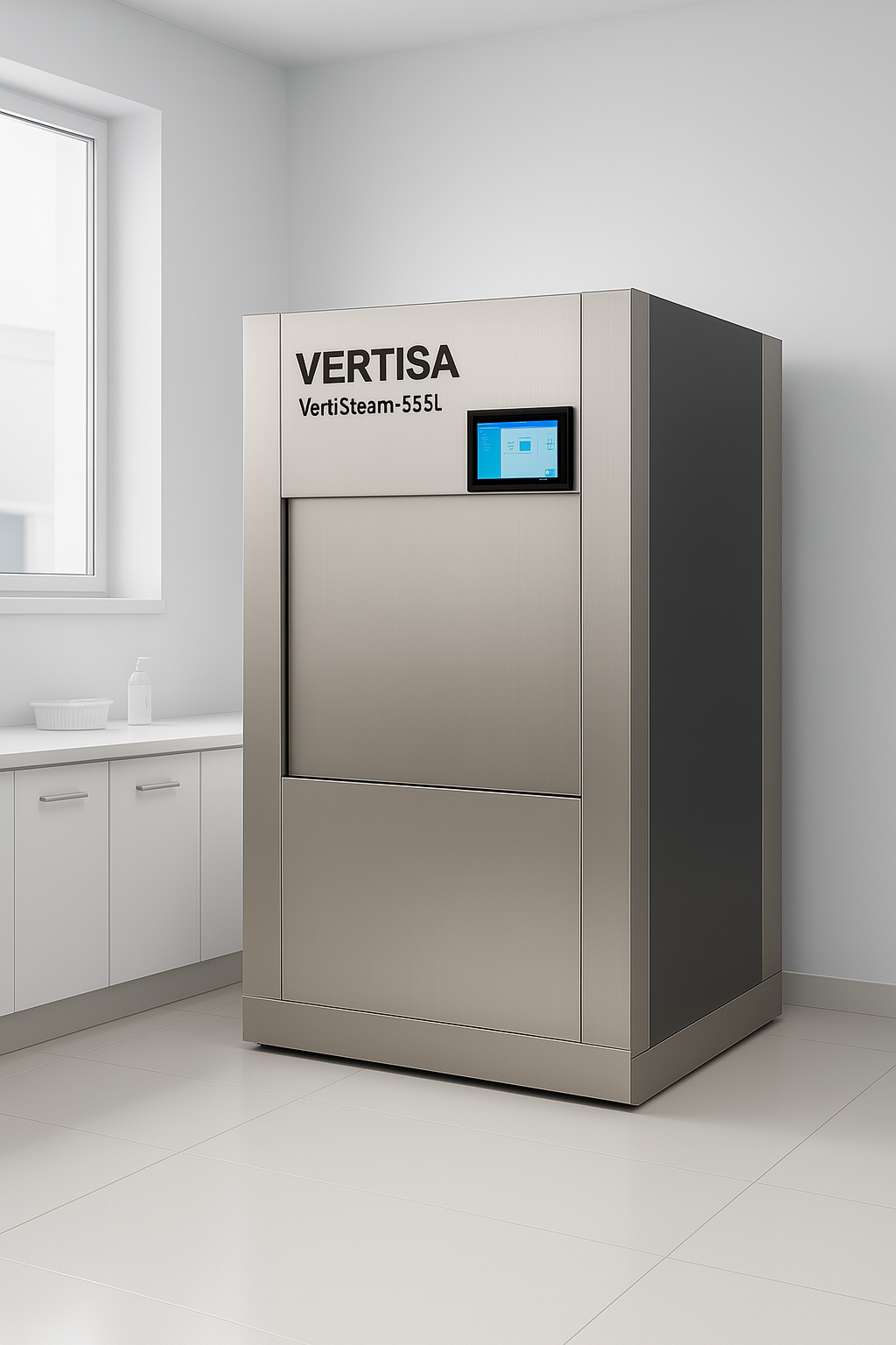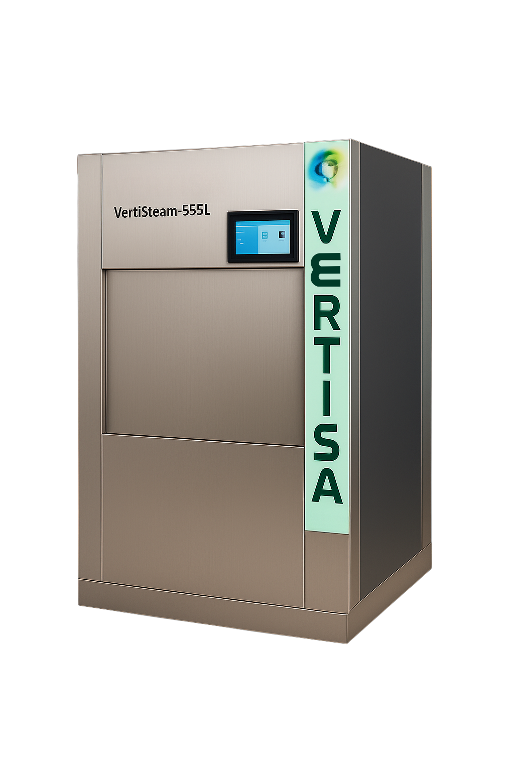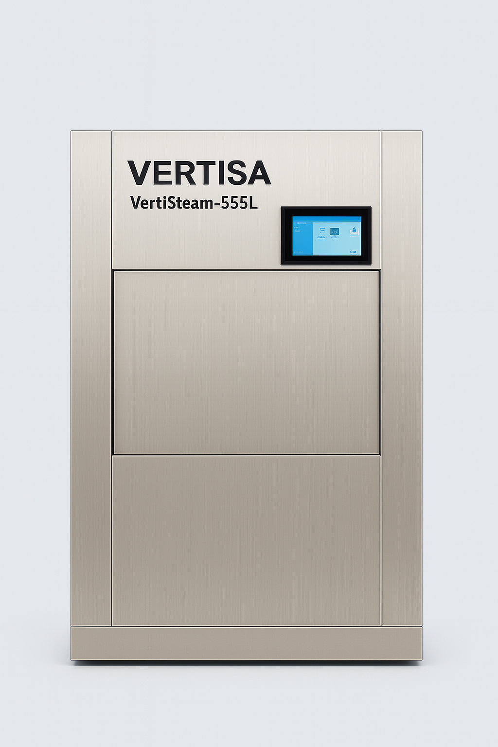 The Vertisa VertiSteam 555L Steam Sterilizer is designed to the highest standards for the sterilization of surgical instruments, textile products, rubber, and heat-resistant plastic materials. Combining reliability, ease of use, and efficiency, this model features a chamber made of AISI 316L grade stainless steel, ensuring long service life and excellent corrosion resistance. Its advanced PLC control system and 7-inch color touchscreen provide precise management and monitoring of all sterilization cycles. The device is fully compliant with key European regulations, including the Medical Device Directive (93/42/EEC), the Pressure Equipment Directive (2014/68/EU), and the EN285 standard.